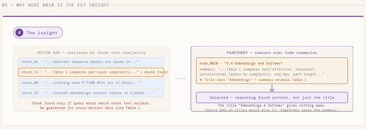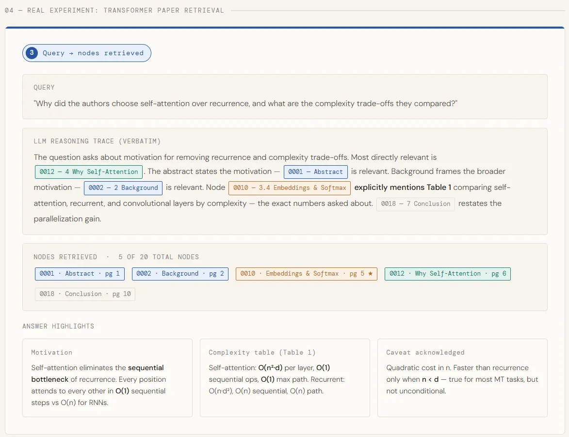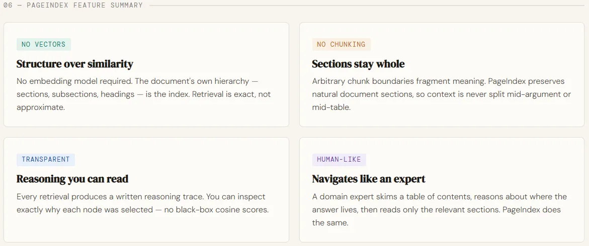 Retrieval is where most RAG systems quietly break down. Native pipelines rely on vector matching—embedding queries and document fragments in the same location and retrieving the same “closest” match. But uniformity is a poor proxy for what we really need: compatibility based on reasoning. In longer, professional documents—such as financial reports, research papers, or legal documents—the correct answer is often not in the same paragraph. It requires a structure to navigate, understand context, and perform multi-step reasoning at every stage. This is exactly where vector-based RAG starts to break down.